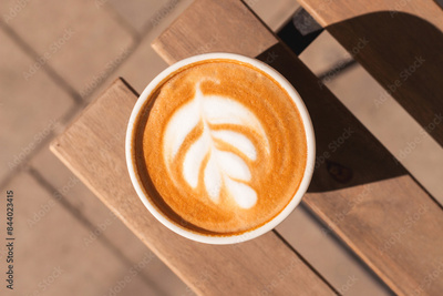 White cup of cappuccino or flat white with latte art on milk foam on wooden table of cafe terrace veranda background. Specialty coffee shop cafeteria. Freshly brewed morning drink. Flat lay, closeup