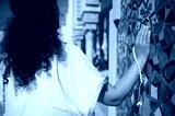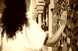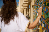 Woman in white traditional dress holding rosary beads near colorful mosaic wall