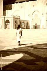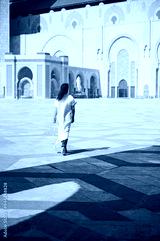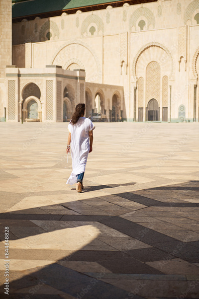 Woman walking in front of a historic mosque in a sunlit courtyard