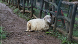 Resting sheep along a muddy farm path with rustic wooden fence and lush green background in an outdoor rural setting.