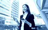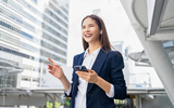Smiling asian businesswoman holding smartphone while standing in front of modern business building, Concept of using the phone to communicate anywhere.