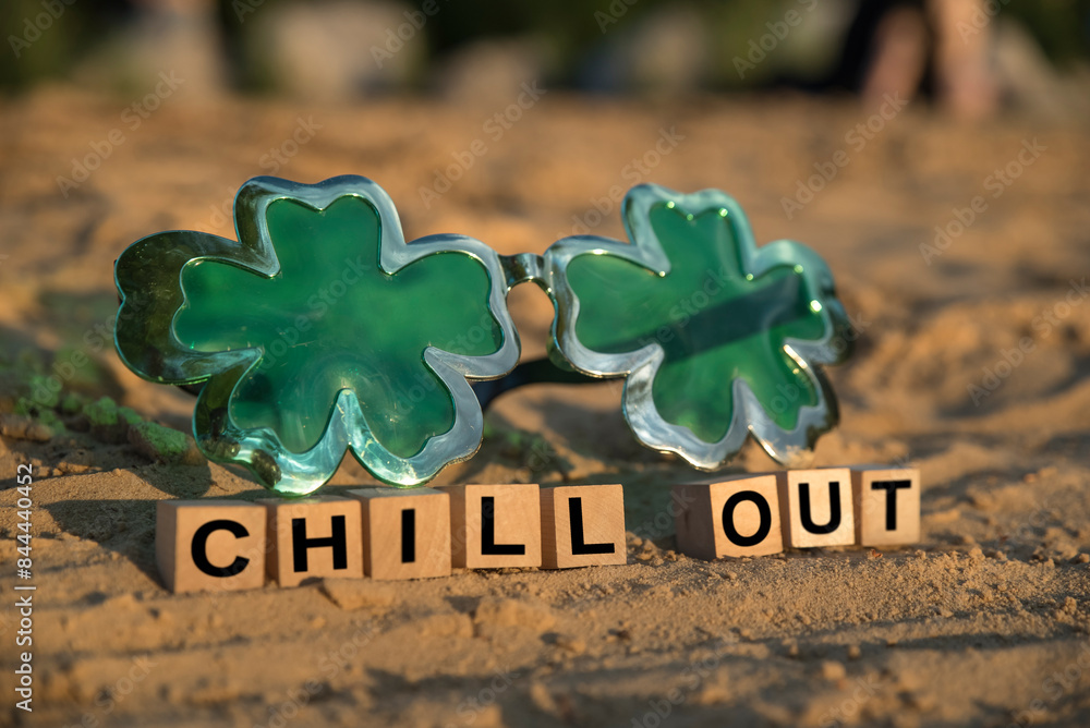 zielone okulary przeciwsłoneczne na piaszczystej plaży z napisem chill out
