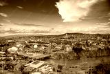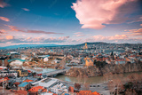 Tbilisi, Georgia. Top View Of Famous Landmarks In spring sunset Evening. Georgian Capital Skyline Cityscape.