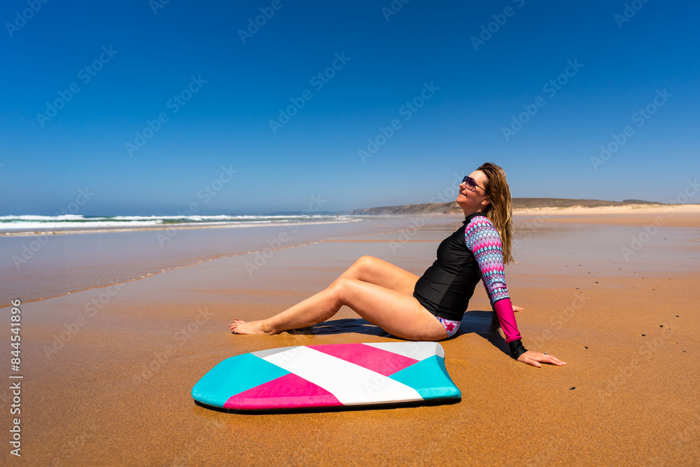 Beautiful woman holding bodyboard sitting on sunny beach Bordeira praia, Algarve , Portugal