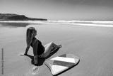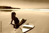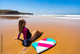 Beautiful woman holding bodyboard sitting on sunny beach Bordeira praia, Algarve , Portugal
