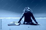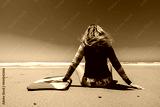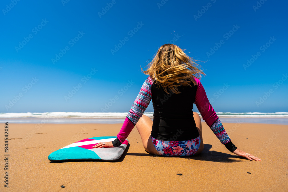 Beautiful woman holding bodyboard sitting on sunny beach Bordeira praia, Algarve , Portugal