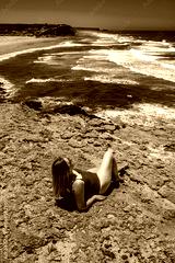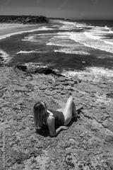 Beautiful woman sitting and sunbathing on cliff near sunny beach Algarve, Monte Clerigo, Portugal