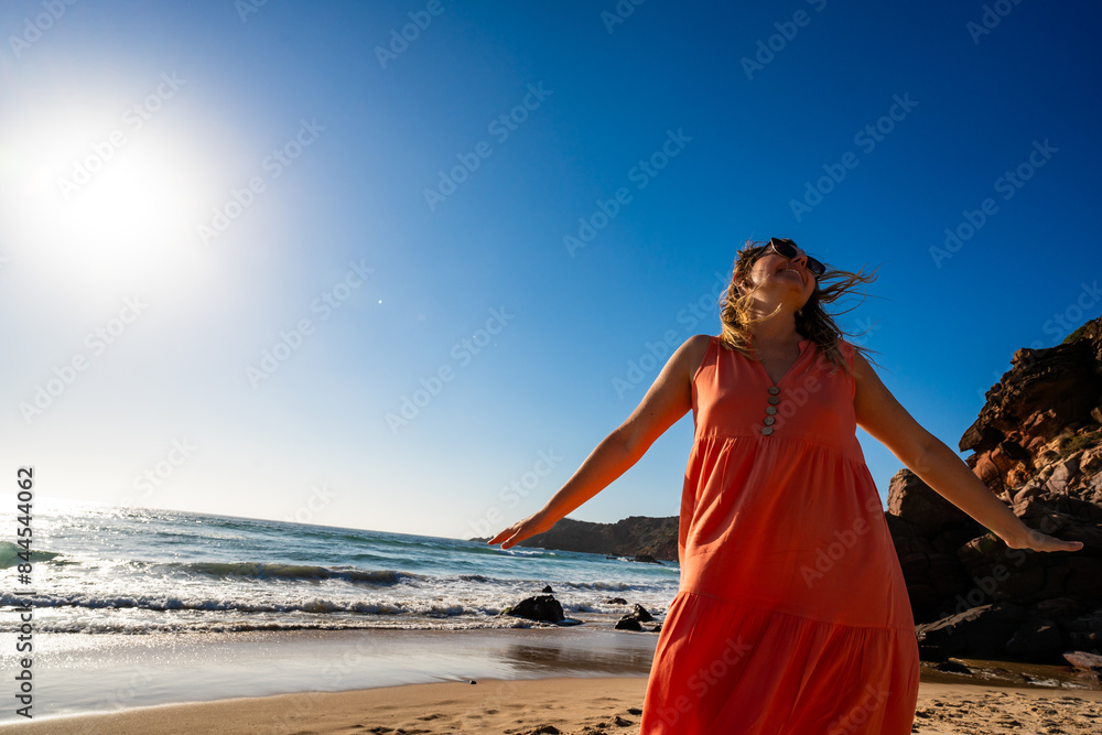 Beautiful woman walking on sunny beach Portugal, Algarve, Amado praia