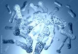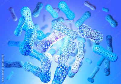 Probiotics substance. Microbiota background. Beneficial bacteria in body. Blue medical background. Probiotics for immunity. Scientific cells. Probiotics from lactobacilli. Medicine, health. 3d image