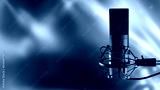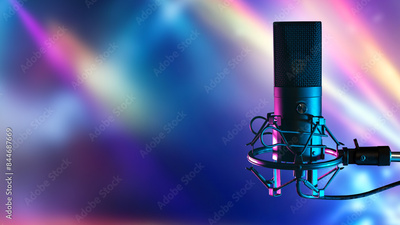 Radio presenter microphone. Condenser mic on tripod. Professional microphone on purple. Sound recording equipment. Microphone for podcast host. Mic for announcer. Place for inscription