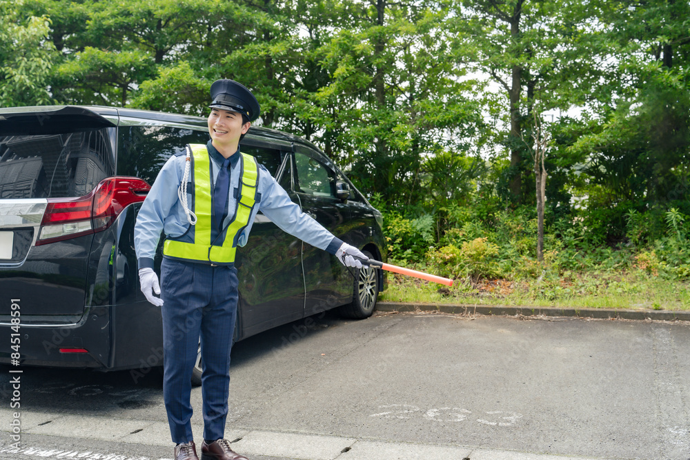 駐車場で誘導する警備員
