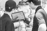 タブレットを見ながら配管・機械を点検するエンジニアのグループ