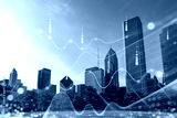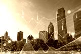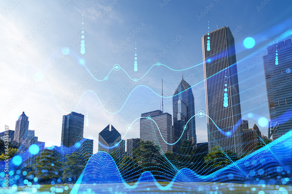 Chicago cityscape with digital holographic interface overlay, depicting futuristic technology concept. Double exposure