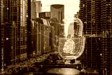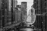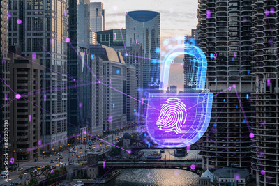 Double exposure of a fingerprint hologram over a Chicago cityscape during dusk, symbolizing future technology and security concepts. Double exposure
