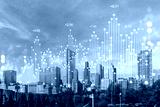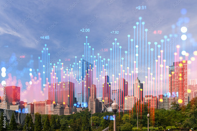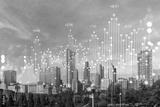 A cityscape with digital financial graph overlay, concept of business and technology in an urban setting. Double exposure