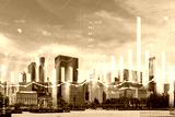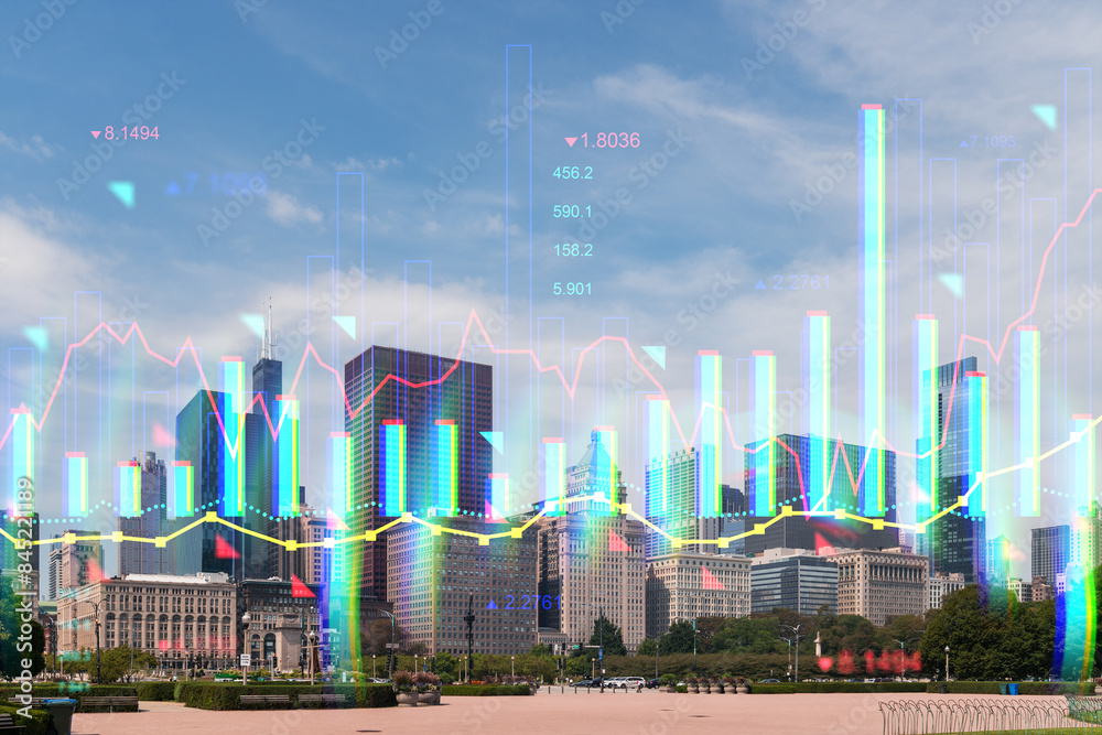 Chicago skyline merged with colorful holographic financial graphs, against blue sky background. Future of technology and finance concept. Double exposure