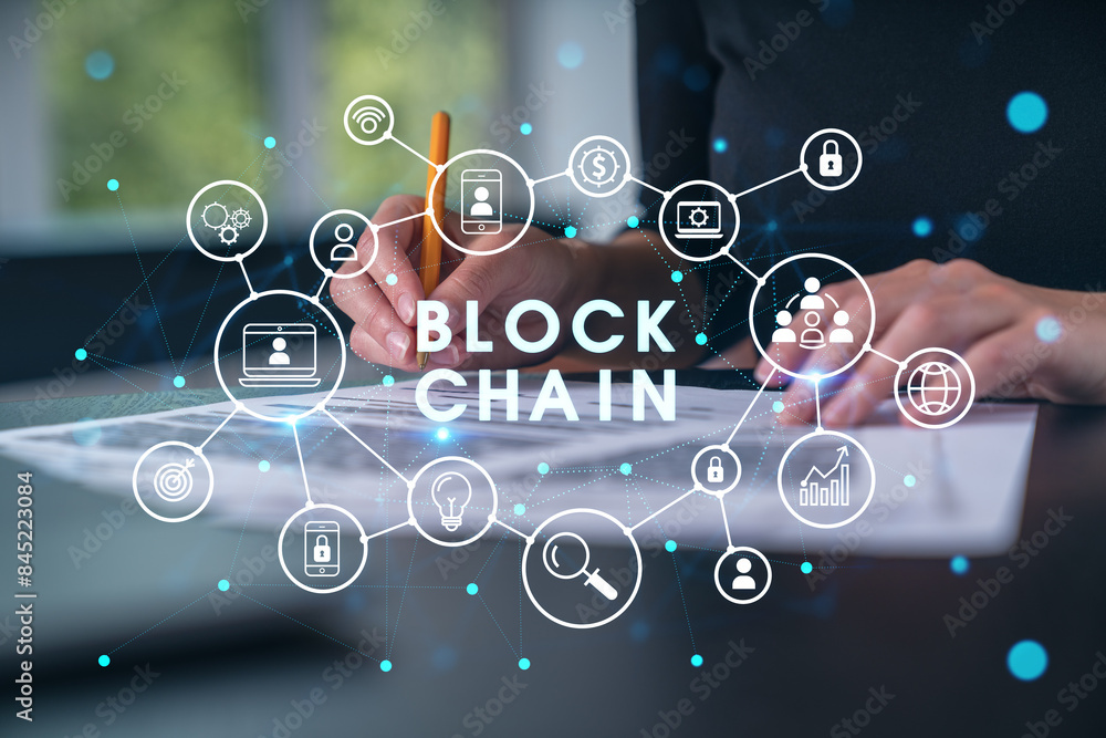 Businesswoman in formal wear taking notes signing contract at office workplace. Concept of important working moments, document sign, working process, concentration. Hands shot. Blockchain hologram