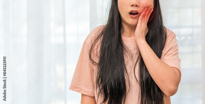 Young asian woman experiencing tooth pain holding cheek with a distressed expression, pain commonly associated with dental issues, dental health, toothache, pain relief and medical care, dental care