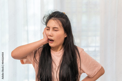 Young asian woman experiencing tooth pain holding cheek with a distressed expression, pain commonly associated with dental issues, dental health, toothache, pain relief and medical care, dental care