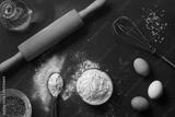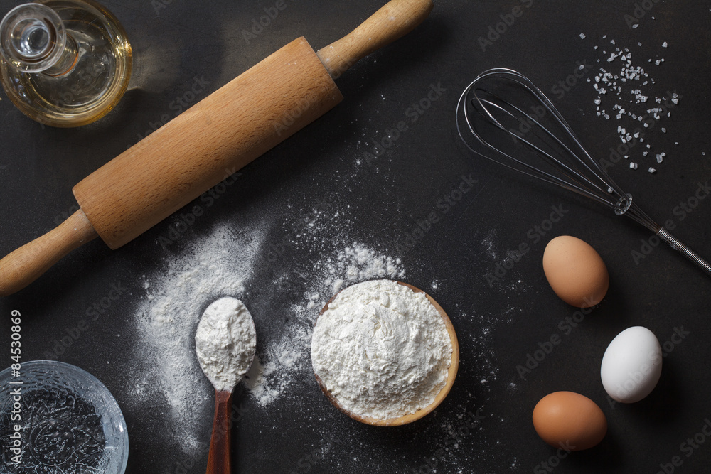 flour and ingredients on black table