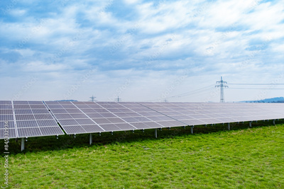 Rows photovoltaic panels stretch across solar farm, capturing sun's energy for sustainable future, Solar farms clean energy, generating electricity from sun's rays