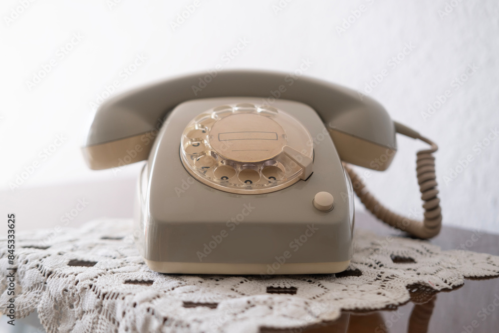 Old white Rotary Telephone with Disc Dial with finger, putting retro phone reciver down, hanging up, calls helpline, psychological support