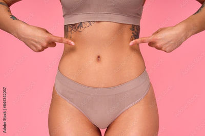 Woman in stylish underwear on pink background promotes body positivity and modern fashion
