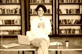 Young smiling happy successful employee business woman wear white shirt casual clothes hold in hand use mobile cell phone sit on table work at office desk with pc laptop. Achievement career concept.