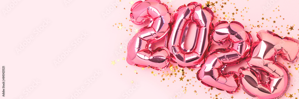 2025 New Year banner with copy space. Pink balloons and shiny stars confetti.