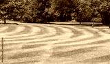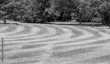 Świeżo skoszony trawnik w parku miejskim wiosną. Regularne wzory tworzone przez koszenie rozległego trawnika w parku w maju.