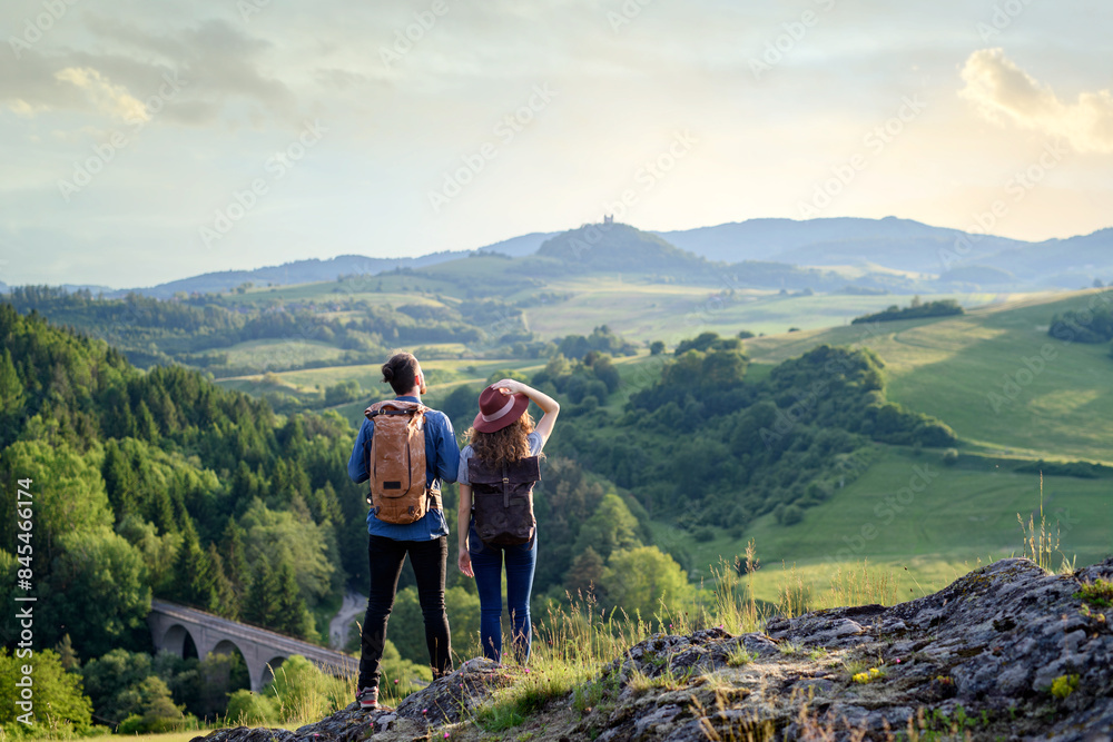 Travellers couple hiking on easy trail in nature with backpacks. Young tourist resting, enjoying breathtaking view. Summer vacation oudoors. Rear view.