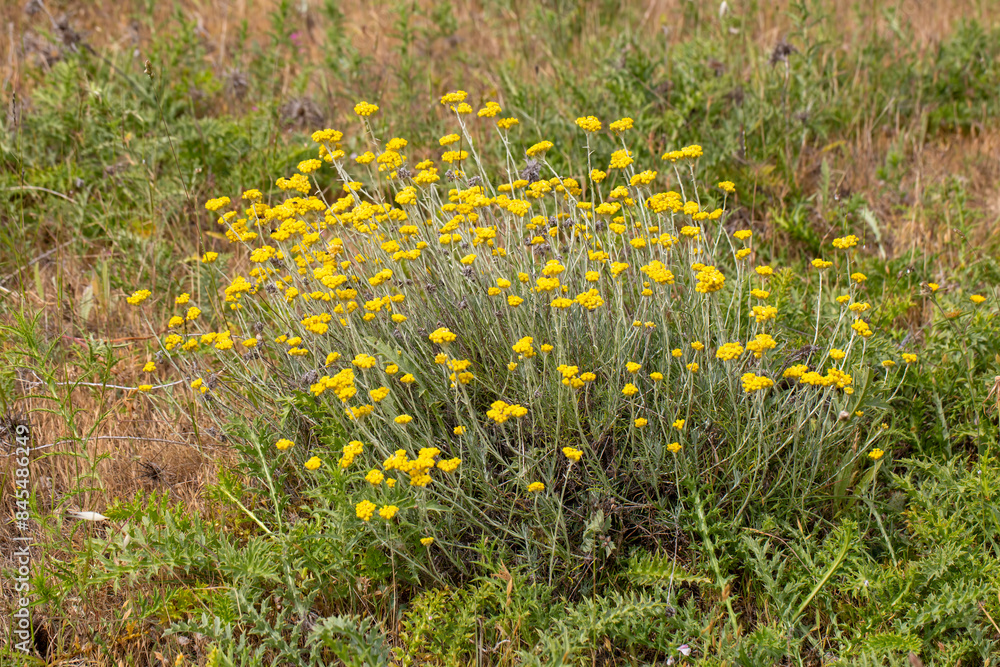 Close up view of helichrysum arenarium, immortel, dwarf everlast sunny yellow flowers