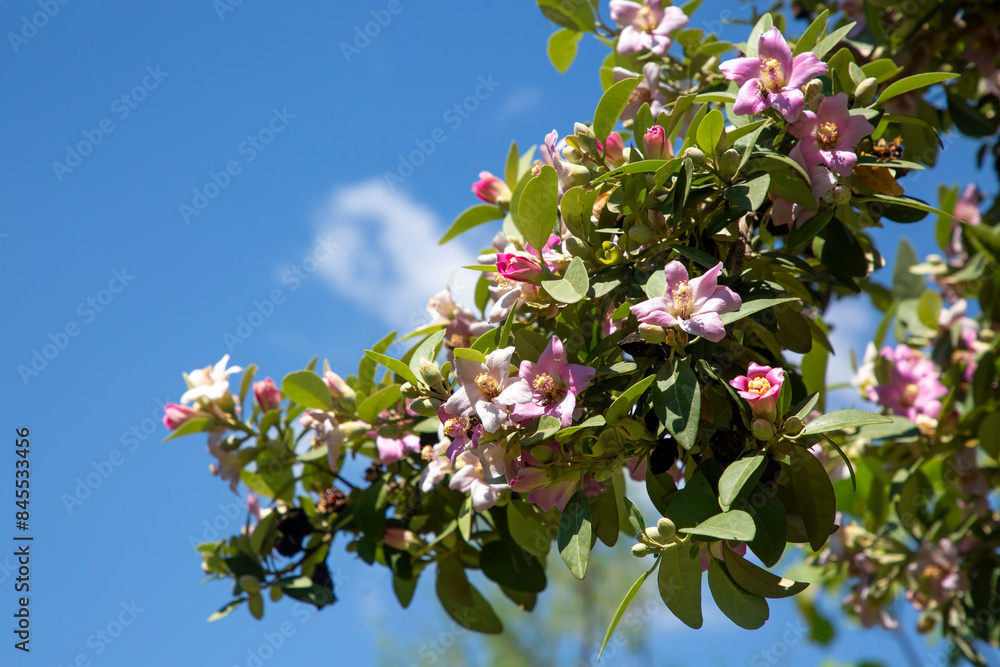 Delicate pink flowers of an exotic tree Lagunaria patersonia