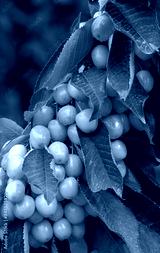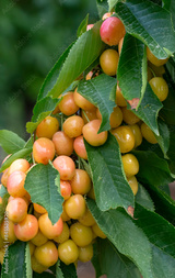 Cherry with leaf and stalk. Cherries with leaves and stalks.