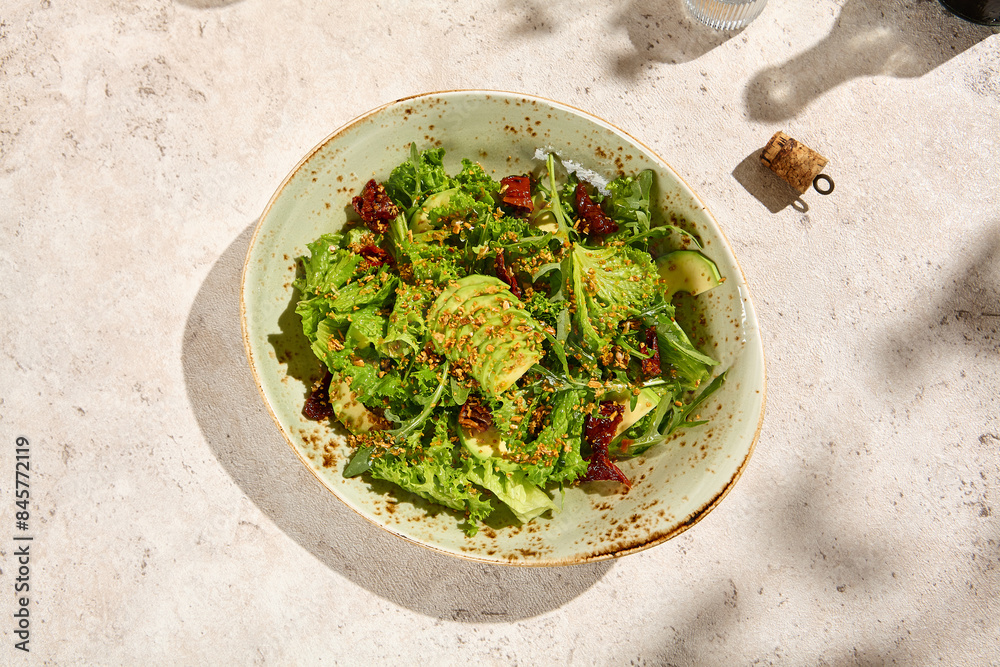 Sunlit Avocado and Dried Tomato Green Salad on Beige Table, Authentic Still Life with Natural Textures and Shadows