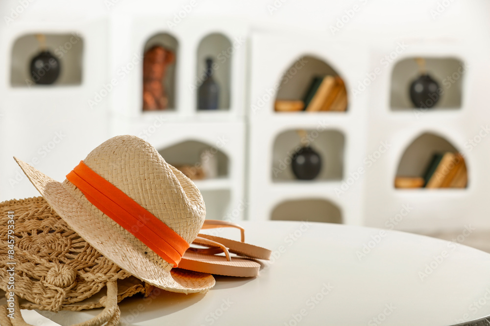 White table background with summer hat and home interior in Greece.