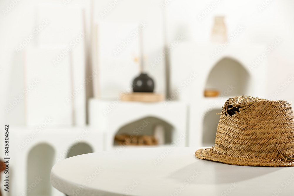 White table of free space and summer hat. Empty space for your decoration.