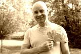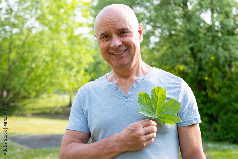 heartwarming portrait senior man smiling serenely while holding green leaf, healthy lifestyle, rejuvenating power nature, interconnectedness humans and nature