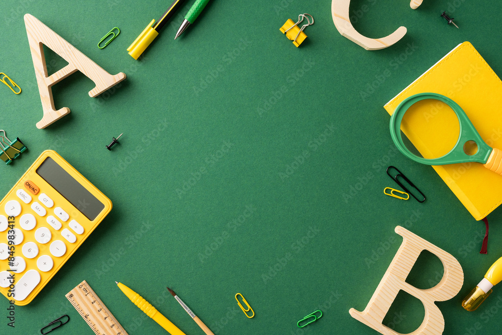 Top view of school supplies and wooden letters on a green background emphasizing back to school atmosphere