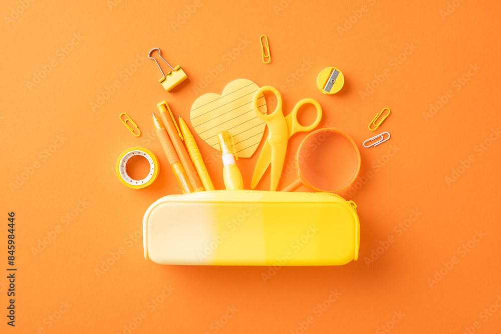 Colorful school supplies on an orange background featuring a variety of stationery items for back to school