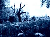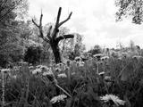 Stary opuszczony drewniany dom i budynki gospodarcze w wiosennej scenerii wśród kwitnących polnych kwiatów.