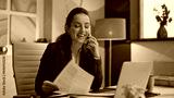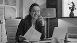 Happy manager calling smartphone looking papers office. Smiling woman speaking