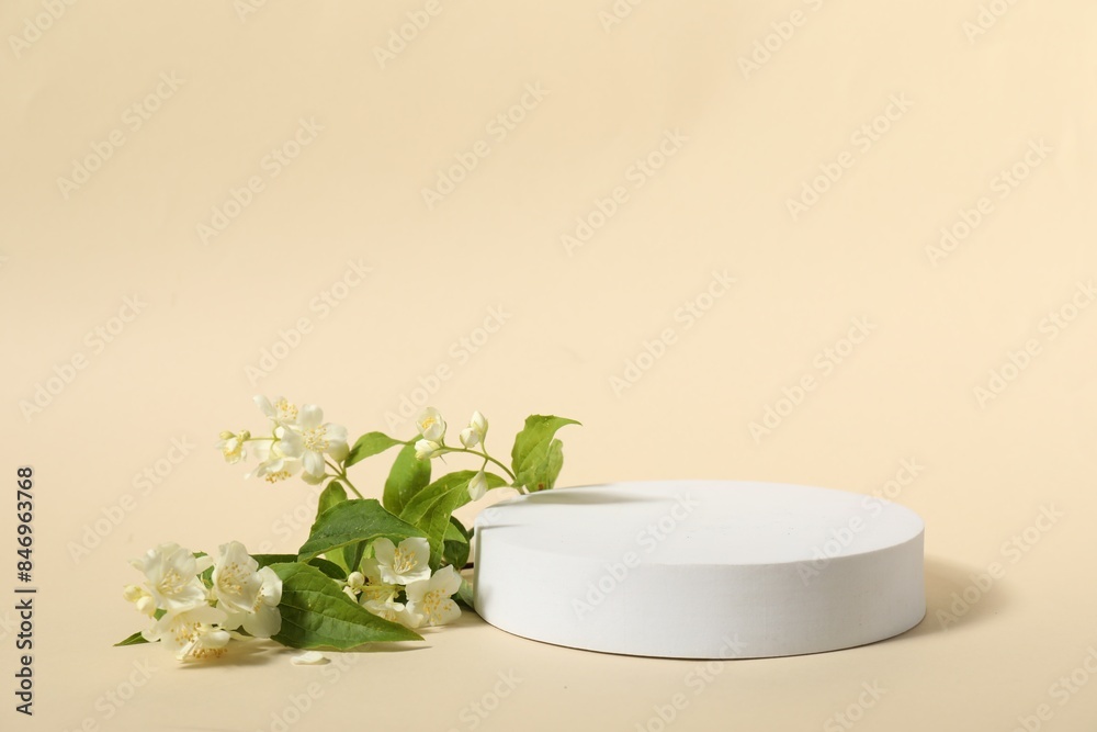 Presentation of product. White podium and beautiful jasmine flowers on beige background, space for text