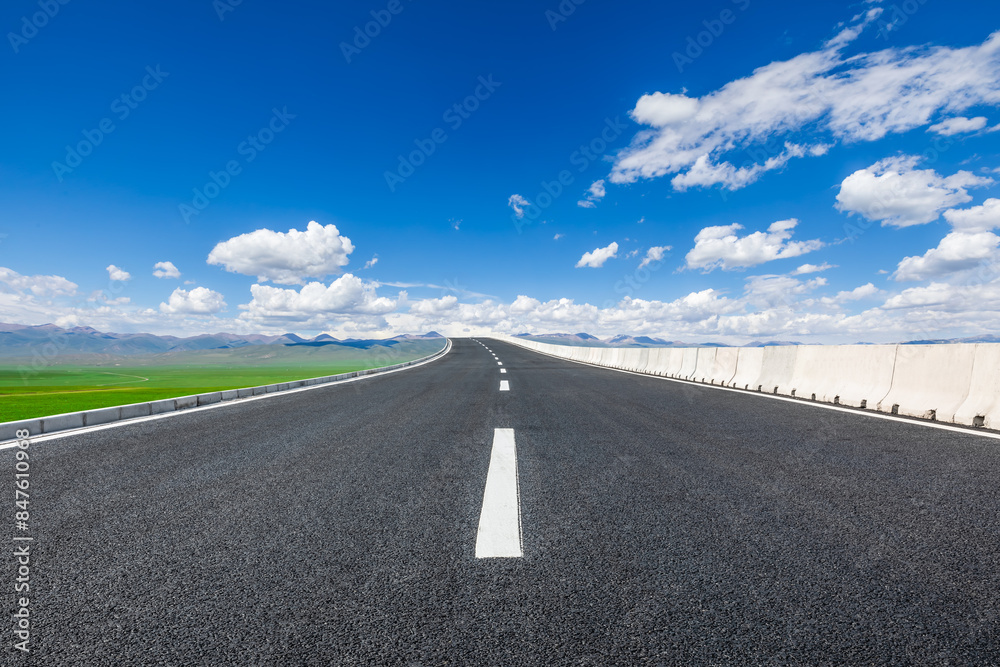 Asphalt highway road and green meadow with mountain nature landscape under blue sky