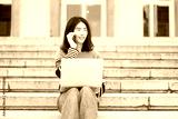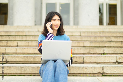 chinese Student in colorful sweater and jeans sits on university steps, using a laptop and talking on the phone.