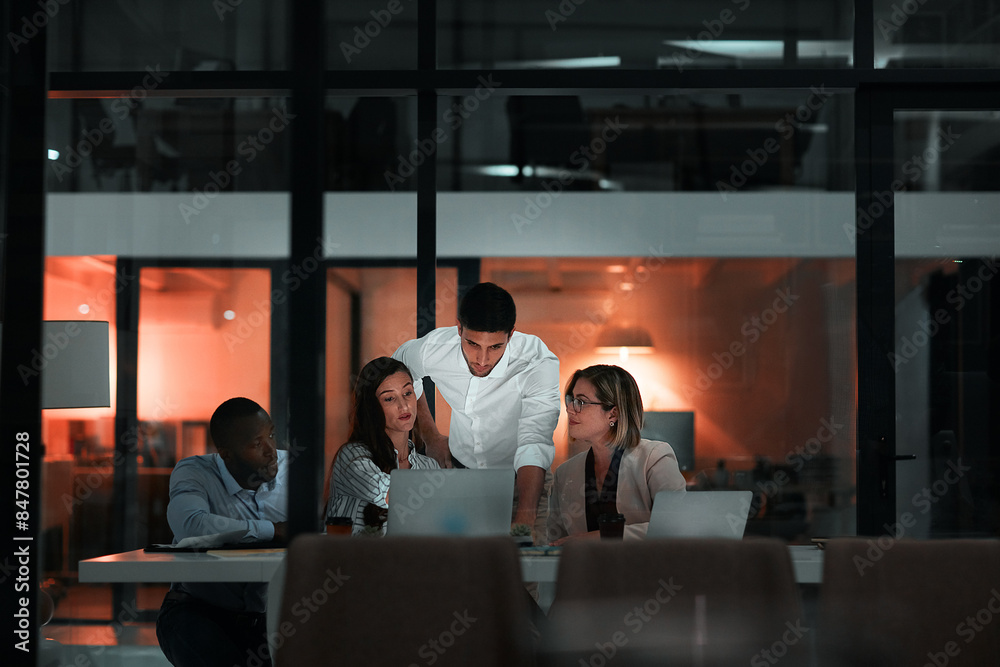 Teamwork, laptop and business people in office at night with stock market charts for corporate investment. Discussion, computer and financial advisors working on company profit report with deadline.