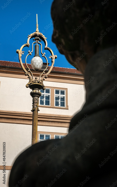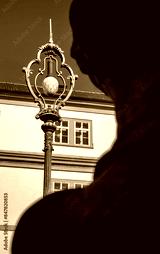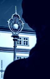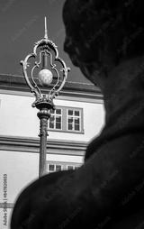 street lamp through the silhouette of a sculpture in the city center of Prague