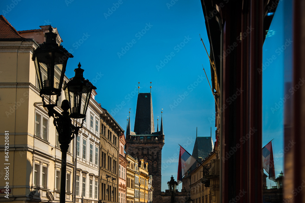 Lantern and buildings in the old town, domes of Charles Bridge and facades of Malostranske, Namesti, Mala Strana, Prague