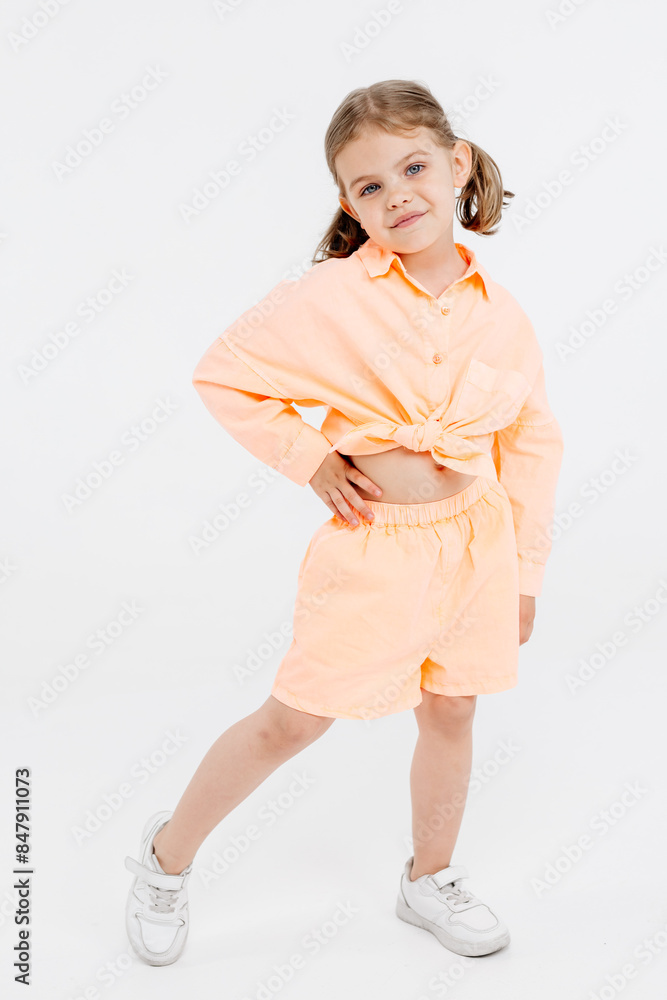 A little girl, stylishly dressed, posing on a white background. Concept of style, fashion and fun and children's emotions.