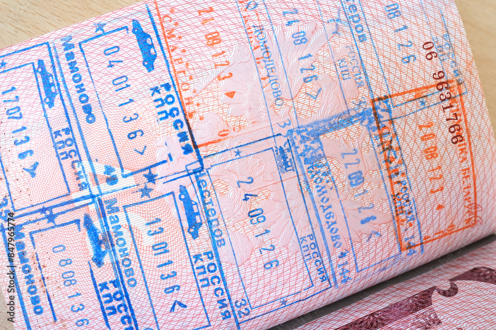 close up part of pages of foreign passport with foreign visas, border stamps, permits to enter countries, concept of traveling around the world, traveler's travel document